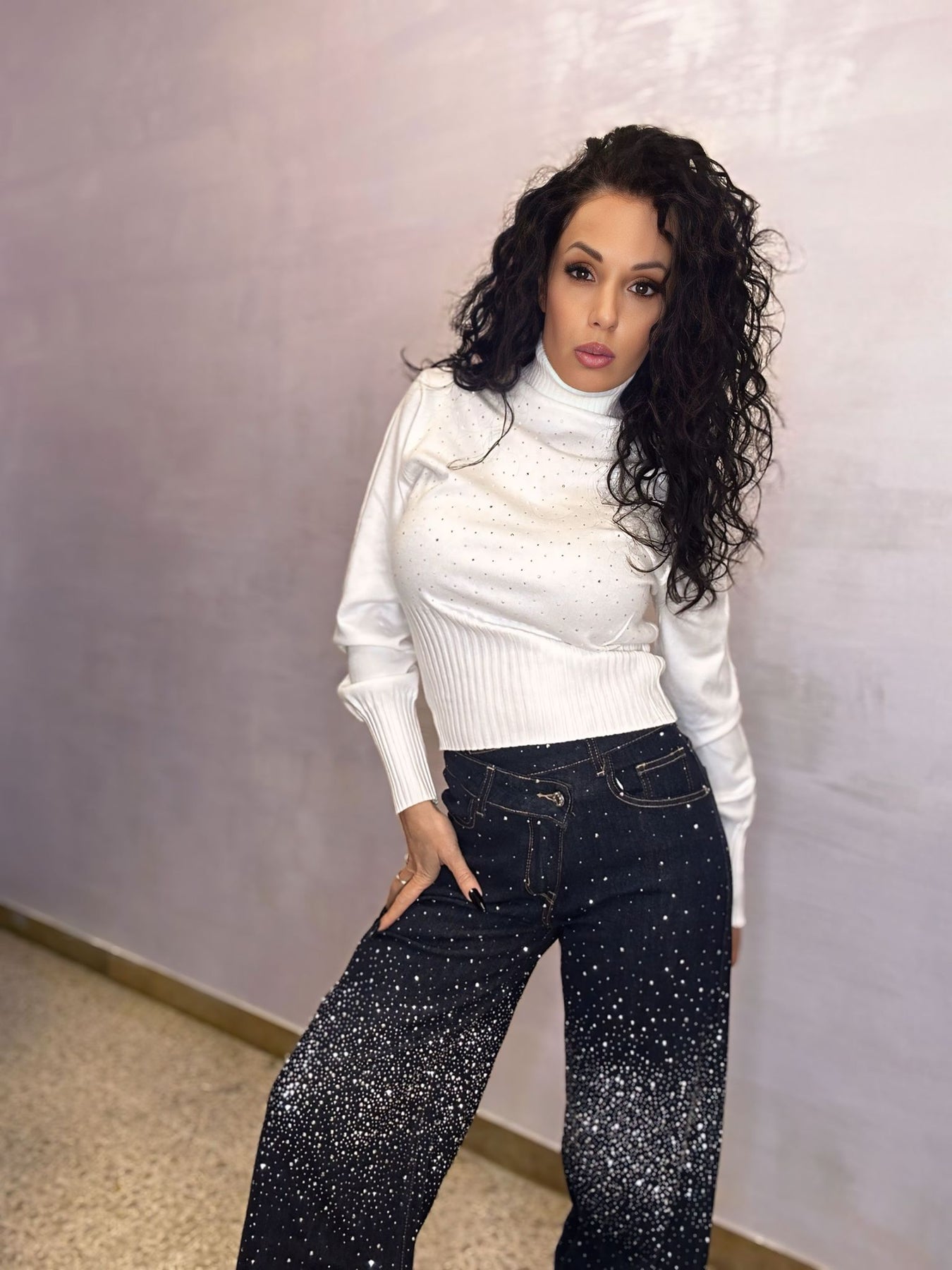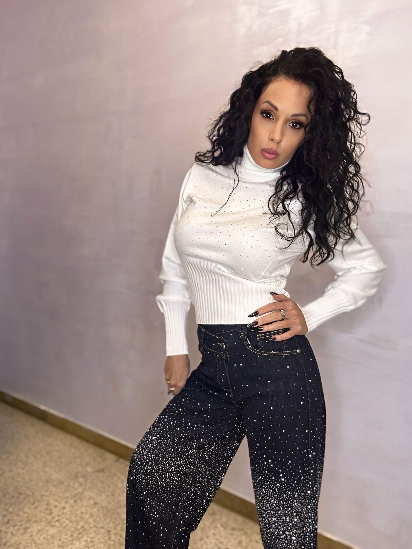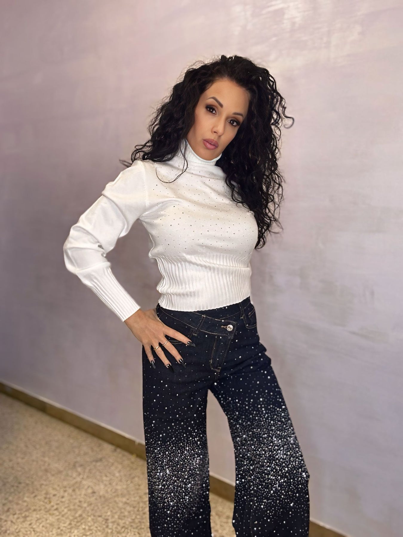 Il pantalone Galassia è un vero spettacolo di luce! Realizzato in jeans blu scuro elasticizzato, avvolge la figura con una vestibilità comoda e glamour. L’intera parte frontale e posteriore è ricoperta di brillantini, creando un effetto luminoso irresistibile, ideale sia per look casual chic che per outfit più eleganti.