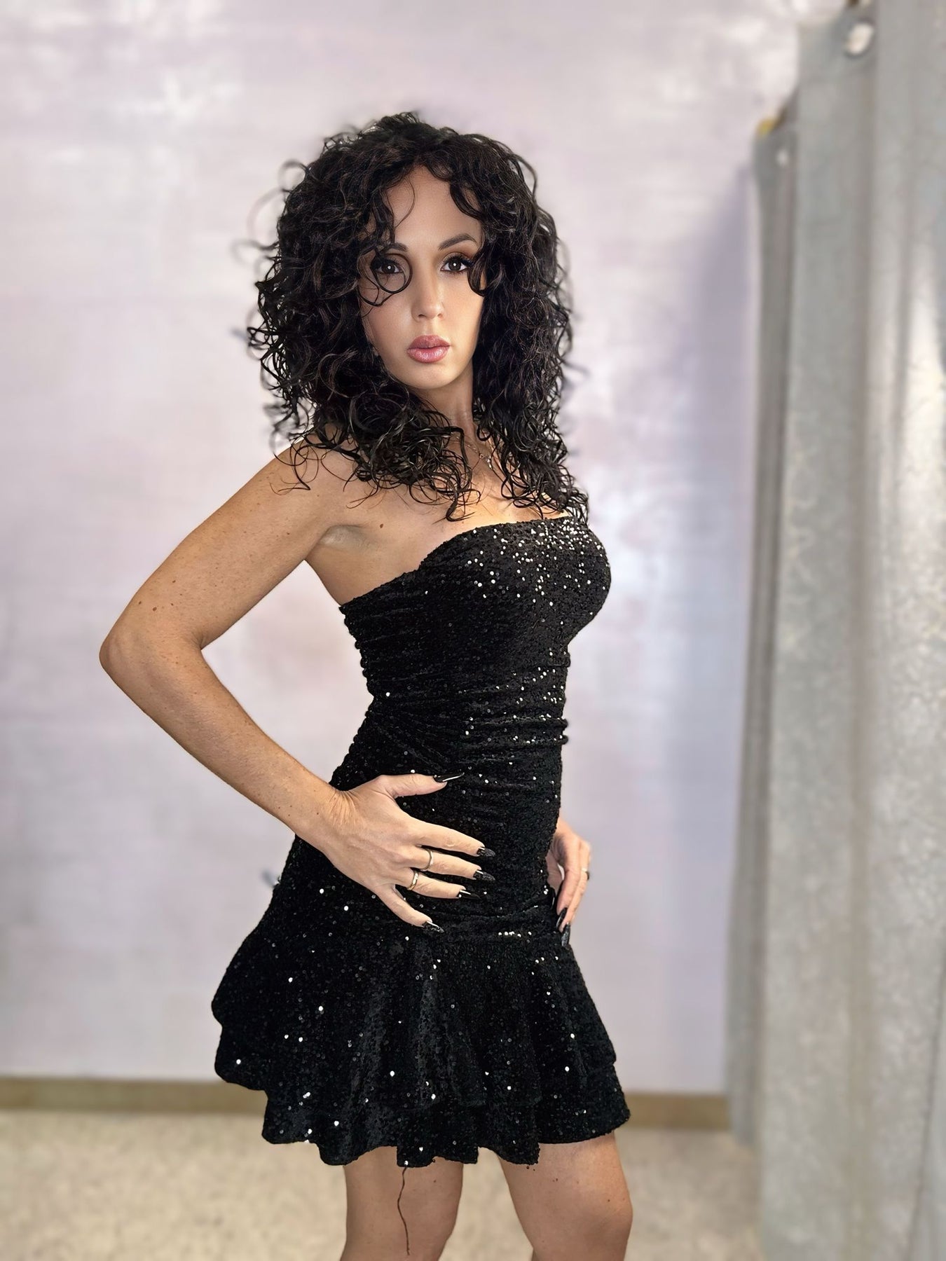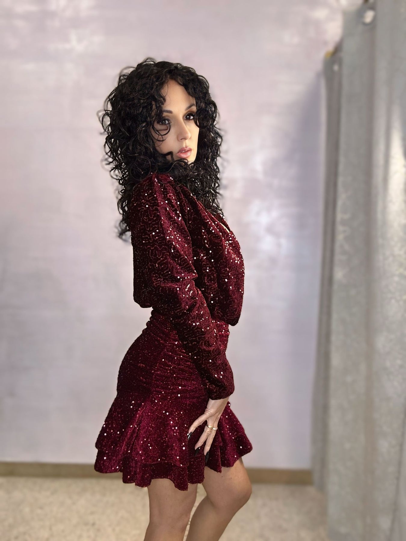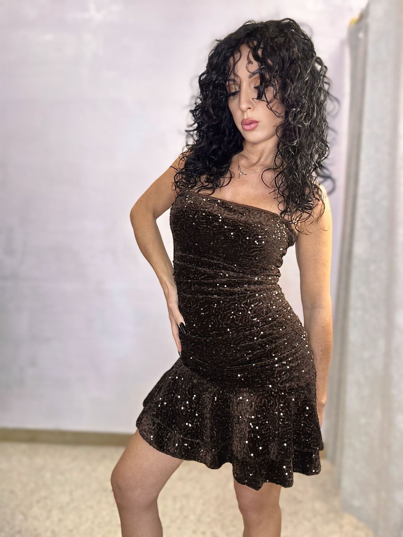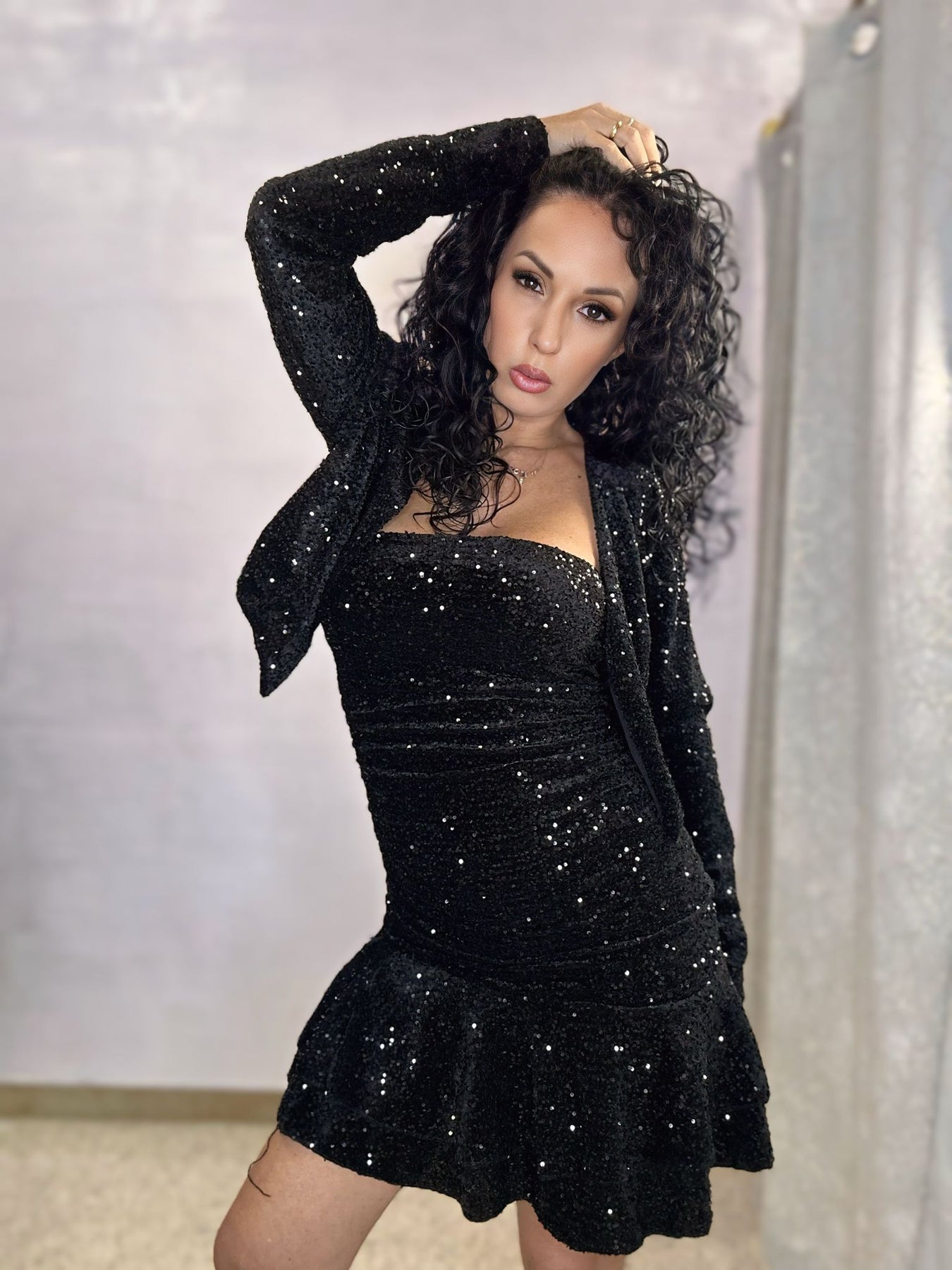 ✨ Giacchina abbinata in velluto e micro paillettes, leggera e raffinata, perfetta per completare il look e renderlo ancora più elegante.
