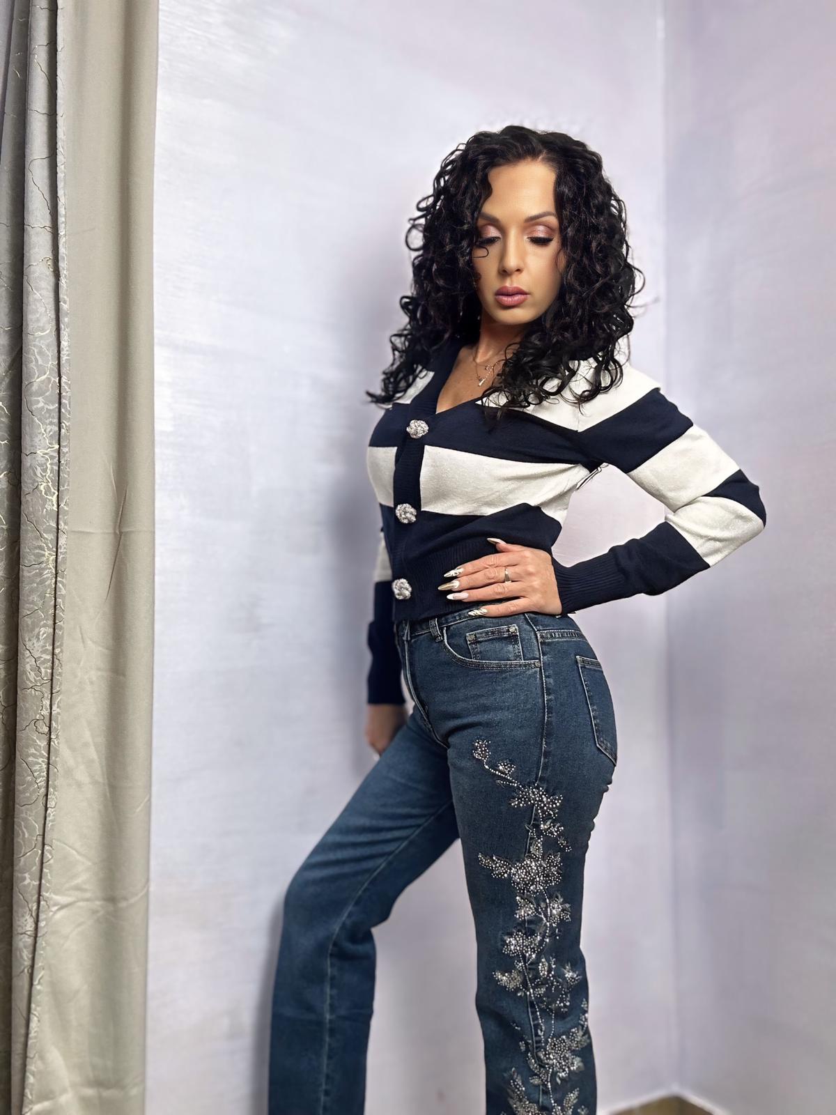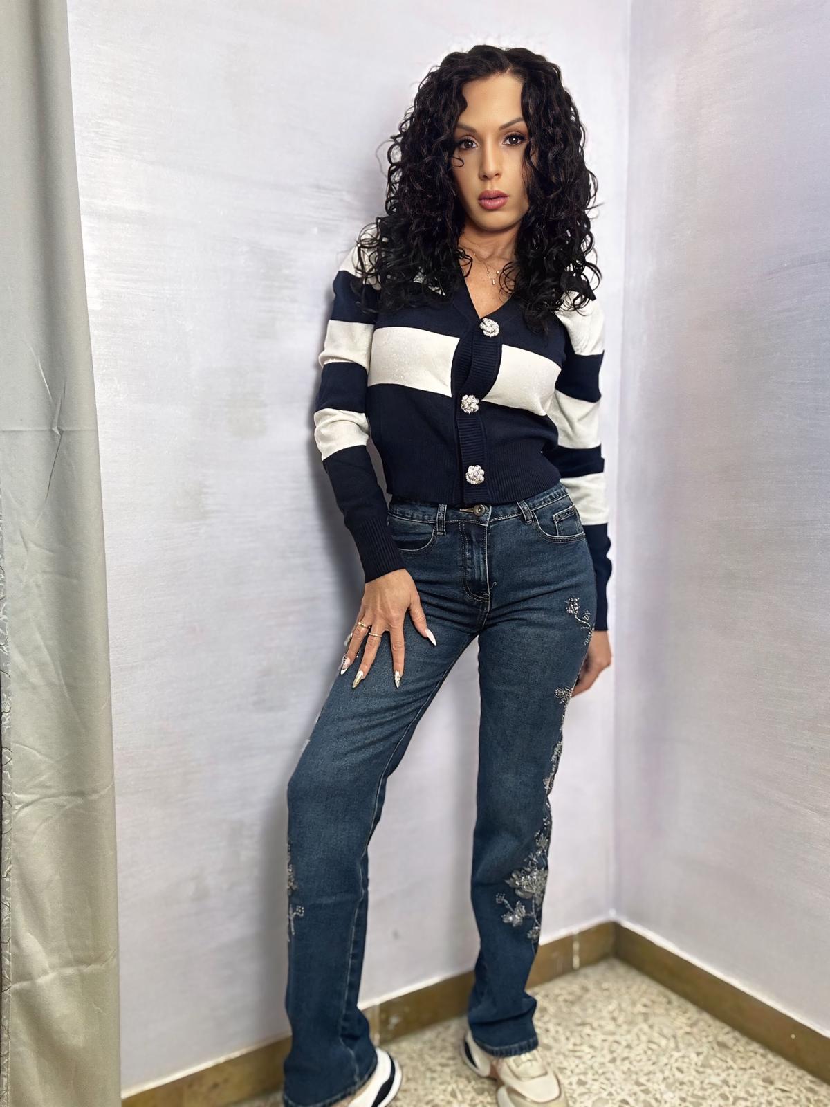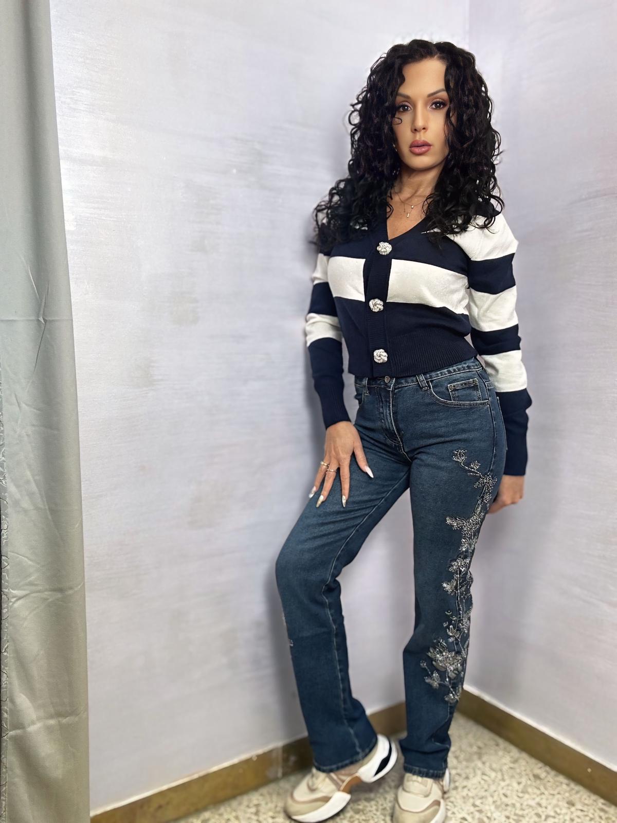 Un jeans che non passa inosservato! Modello moderno e femminile in denim elasticizzato, studiato per garantire una vestibilità comoda e valorizzante. Il colore blu intenso è impreziosito da dettagli ricamati laterali con brillantini luminosi, che donano un tocco glam e sofisticato al capo.