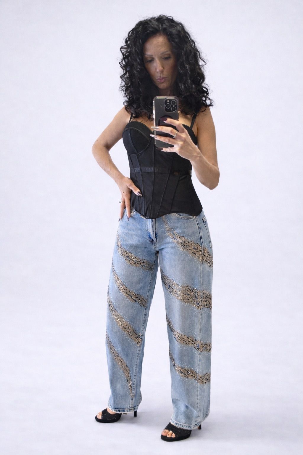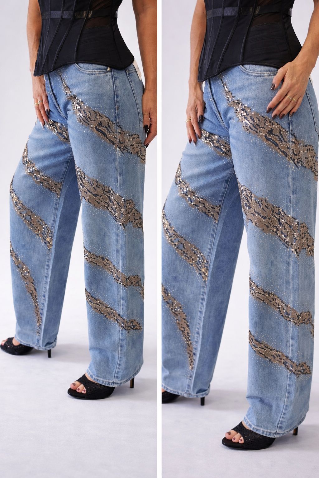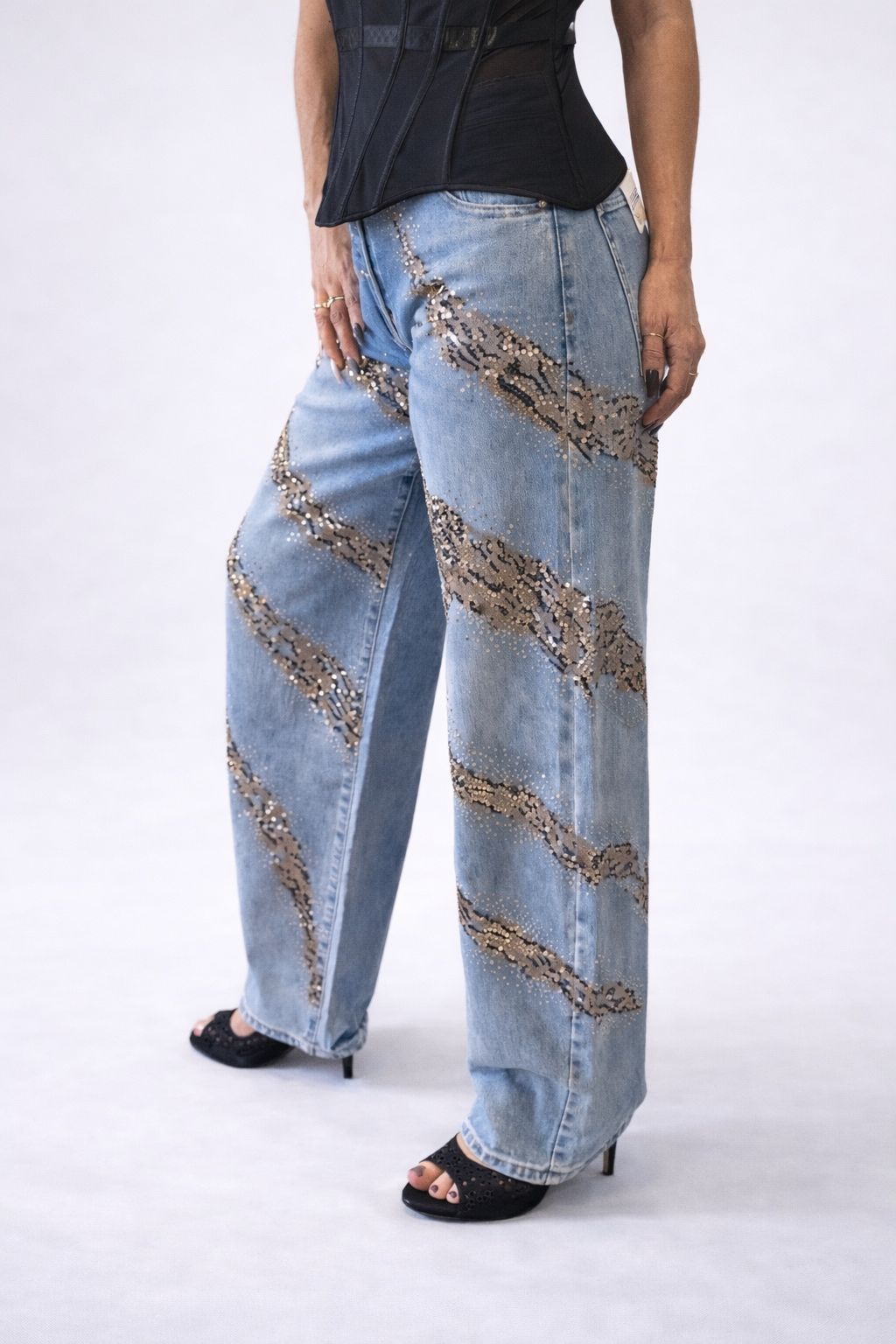 💎 Il suo punto forte sono i dettagli brillantinati particolari nei toni del nero e ambrati, che creano un effetto luminoso raffinato e di grande impatto su una base blue jeans chiara, tra le più richieste del momento.
