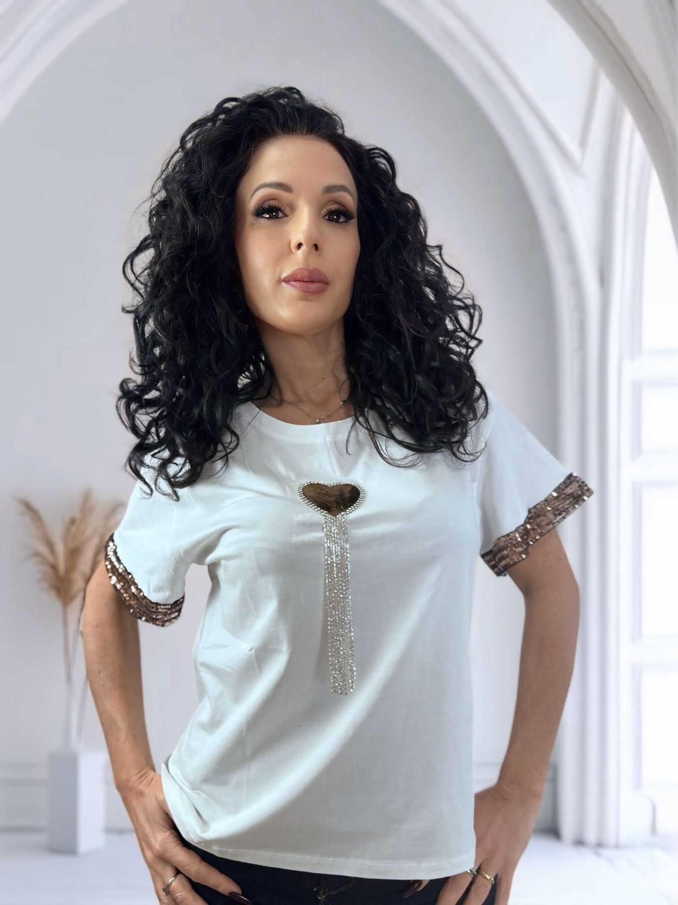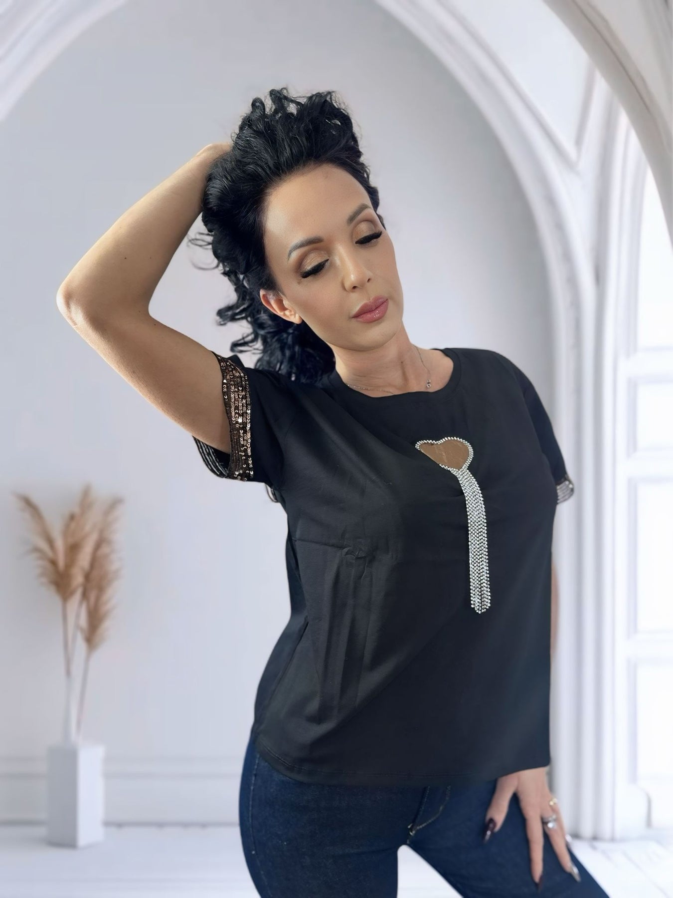 La maglia Love è il perfetto equilibrio tra semplicità e dettagli luminosi, ideale per dare un tocco raffinato anche agli outfit più basic.
